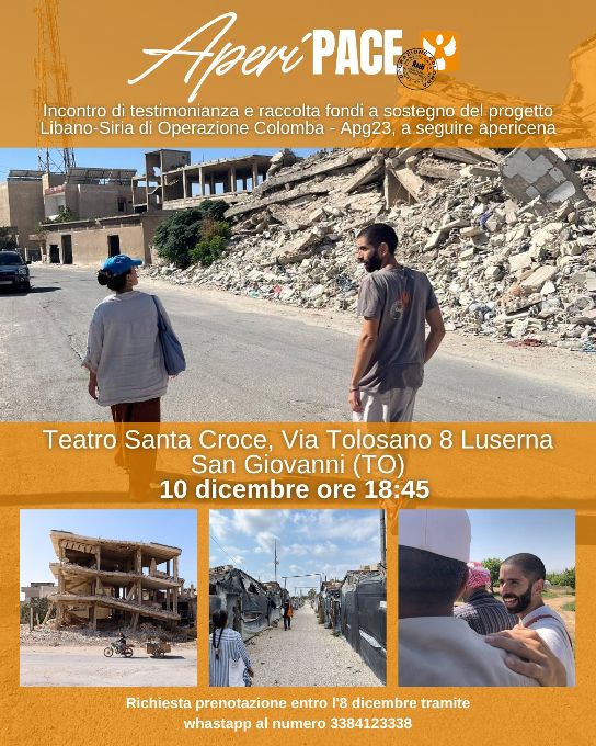 Descrizione Incontro di testimonianza e raccolta fondi a sostegno del progetto Libano-Siria di Operazione Colomba e a seguire apericena.
