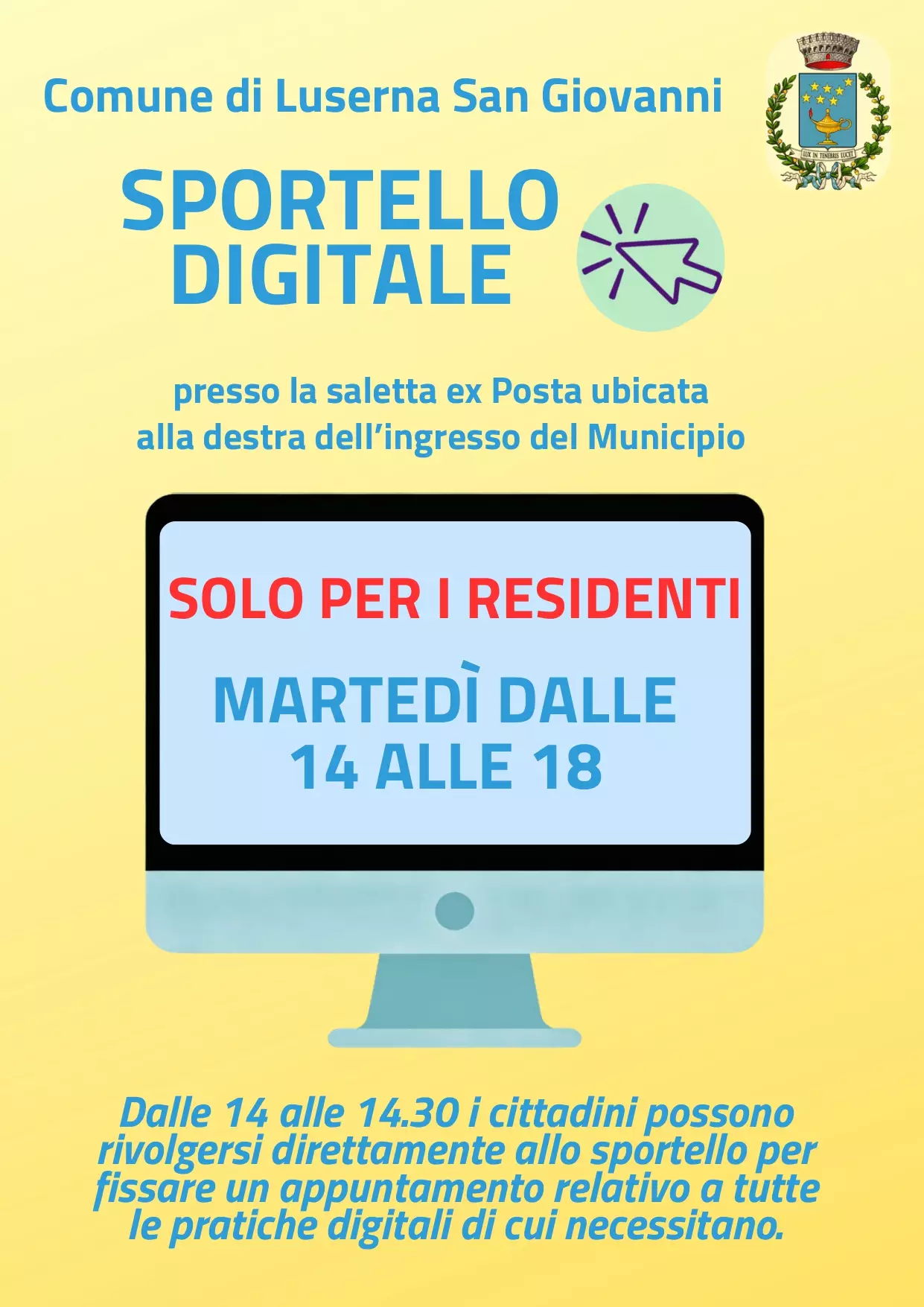 Descrizione Si comunica che lo sportello digitale si è trasferito nei locali della sala ex posta al piano terreno a destra dell'ingresso del Municipio. Il servizio è rivolto solamente ai cittadini residenti.